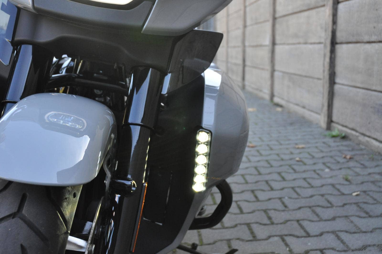 Namontovány doplňky H-D: druhá řadící páka (pata), doplňková světla, opěrka řidiče, předkopy na padacím rámu.